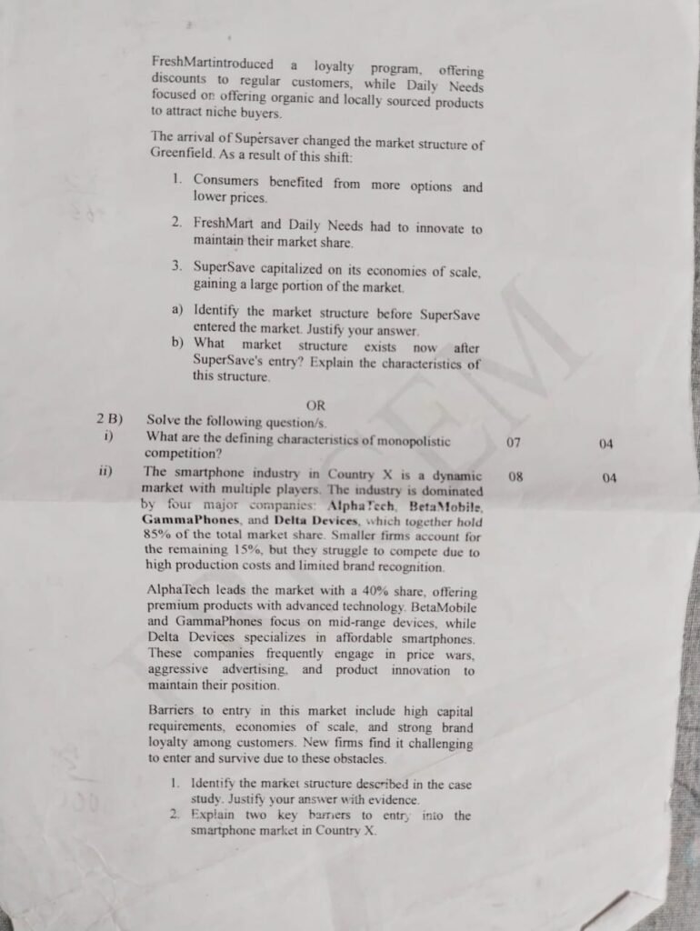 After SuperSave’s entry, the structure changes significantly. Now there are three major players, with SuperSave operating on a much larger scale and offering a wide variety of products at lower prices. This creates an oligopolistic market structure in Greenfield. Key characteristics of oligopoly seen in the case are: